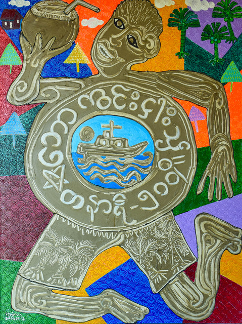 Htein Lin is a renowned Myanmar artist known for his powerful mixed media works that blend traditional techniques with contemporary themes.